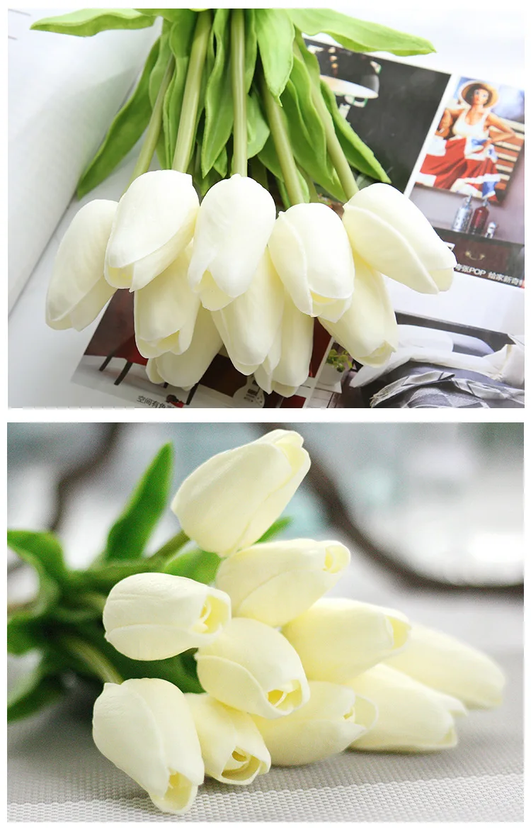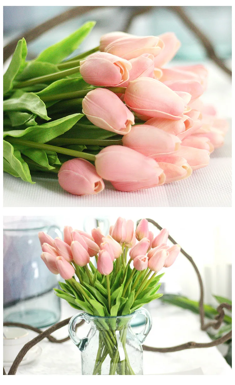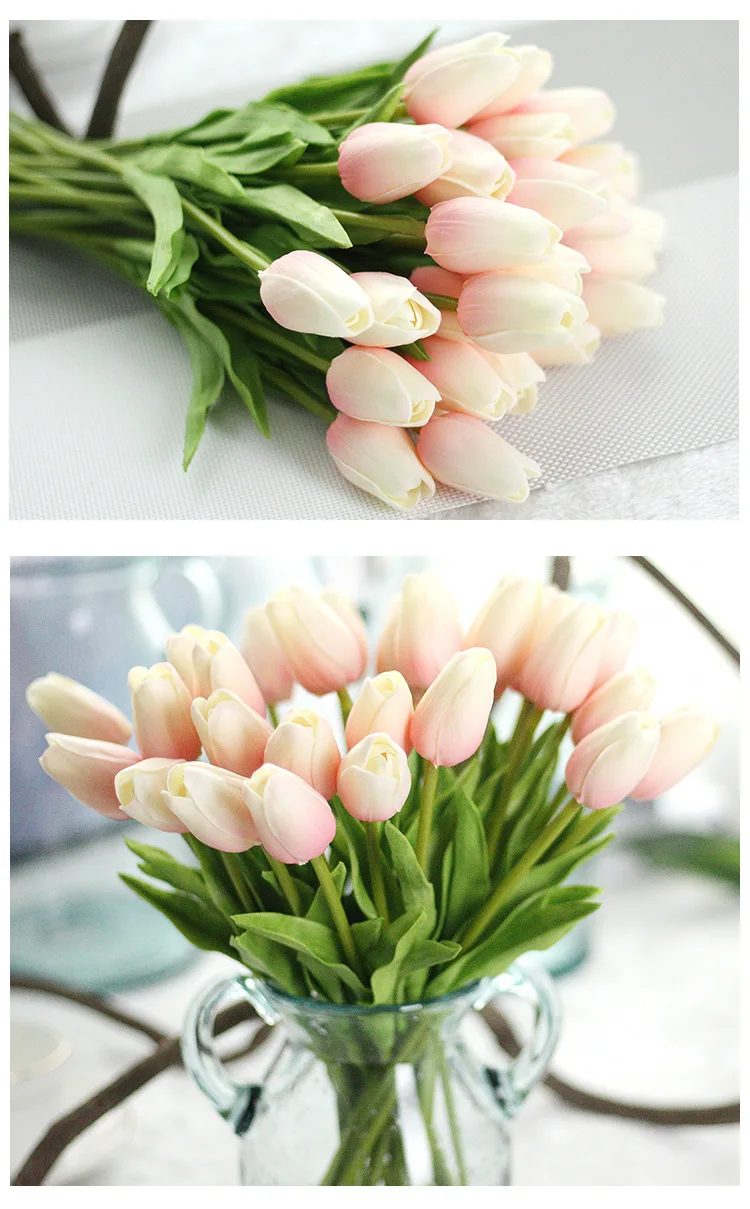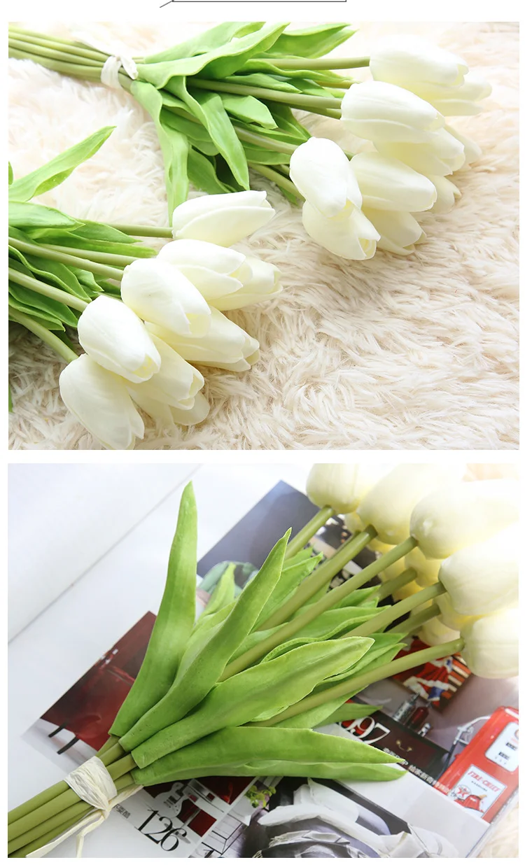 Disse kunstige tulipanene er ideelle for bryllupsdekorasjoner. Deres elegante og tidløse design gjør dem perfekte for å skape vakre blomsteroppsatser, borddekorasjoner, eller som en del av brudebuketten. De tilfører et snev av vår og friskhet til enhver anledning, og vil se fantastiske ut på både bilder og i virkeligheten.