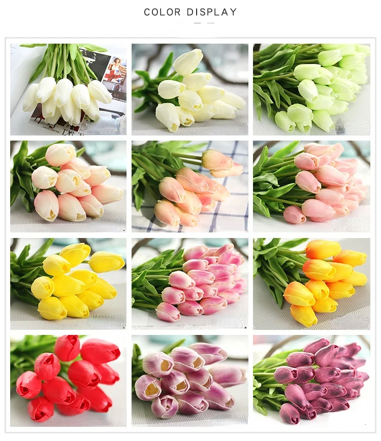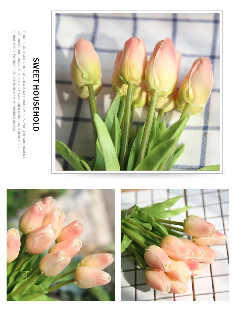 Ikke bare er disse tulipanene flotte for spesielle anledninger, de fungerer også utmerket som hverdagsdekorasjoner i hjemmet. Legg dem i en vase på stuebordet, på kommoden i gangen, eller som en del av et større blomsterarrangement. Kunstige blomster som disse gir rommet et friskere utseende uten behov for stell. Du kan også bruke dem til DIY-prosjekter som kranser, blomsteroppsatser og andre dekorative elementer.